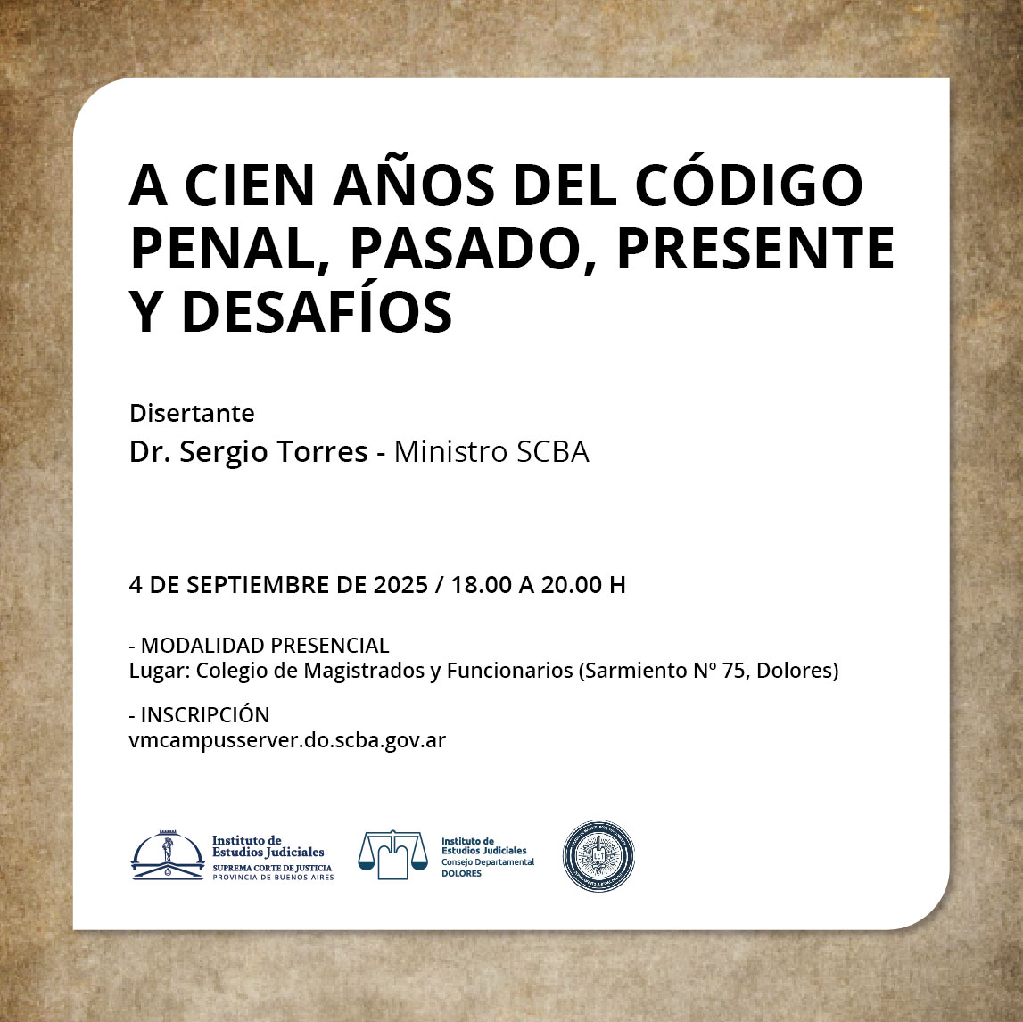 Disertante: Dr. Sergio Torres / Fecha y horario: 4 de septiembre de 2025, de 18 a 20 h / Lugar: Colegio de Magistrados y Funcionarios Departamental Dolores (Sarmiento Nº75, Dolores).