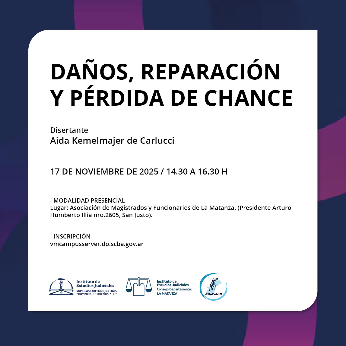 Disertante: Aida Kemelmajer de Carlucci / Fecha y hora: 17 de noviembre de 2025, 14.30 a 16.30 h / Lugar: Asociación de Magistrados y Funcionarios de La Matanza. (Presidente Arturo Humberto Illia nro.2605, San Justo).