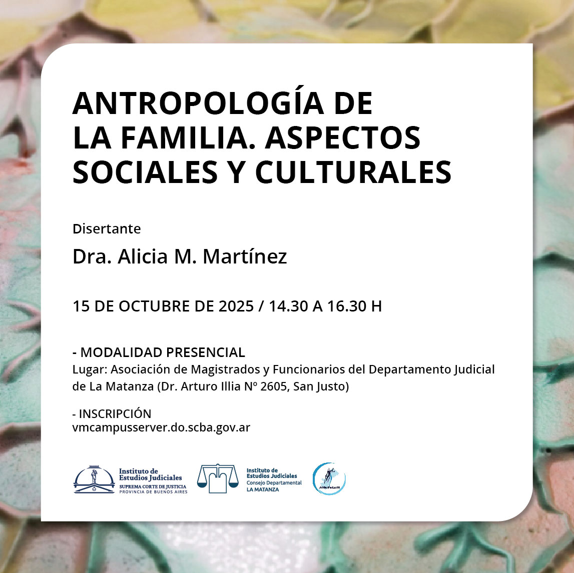 Fecha y horario: 15 de octubre de 2025, de 14.30 a 16.30 h. / Lugar: Asociación de Magistrados y Funcionarios del Departamento Judicial de La Matanza. (Dr. Arturo Illia nro. 2605, San Justo). MODALIDAD PRESENCIAL