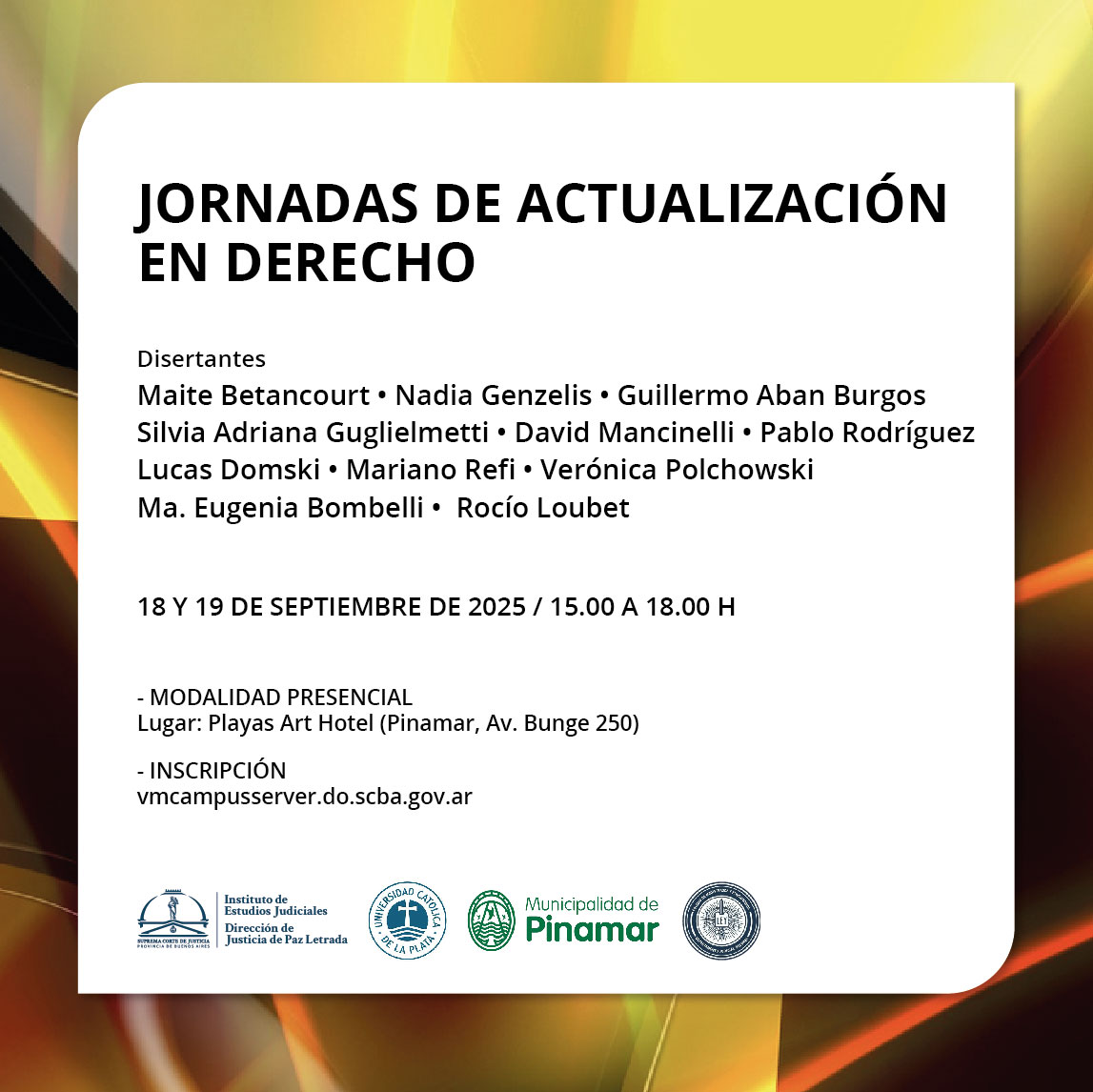 Organizado junto con la Dirección de Justicia de Paz Letrada de la SCBA, la Facultad de Derecho y Ciencias Políticas de la UCALP, la Municipalidad de Pinamar y el Colegio de Magistrados y funcionarios Departamento Judicial Dolores / Fechas y horarios: 18 y 19 de septiembre de 2025, de 15 a 18 h / MODALIDAD PRESENCIAL