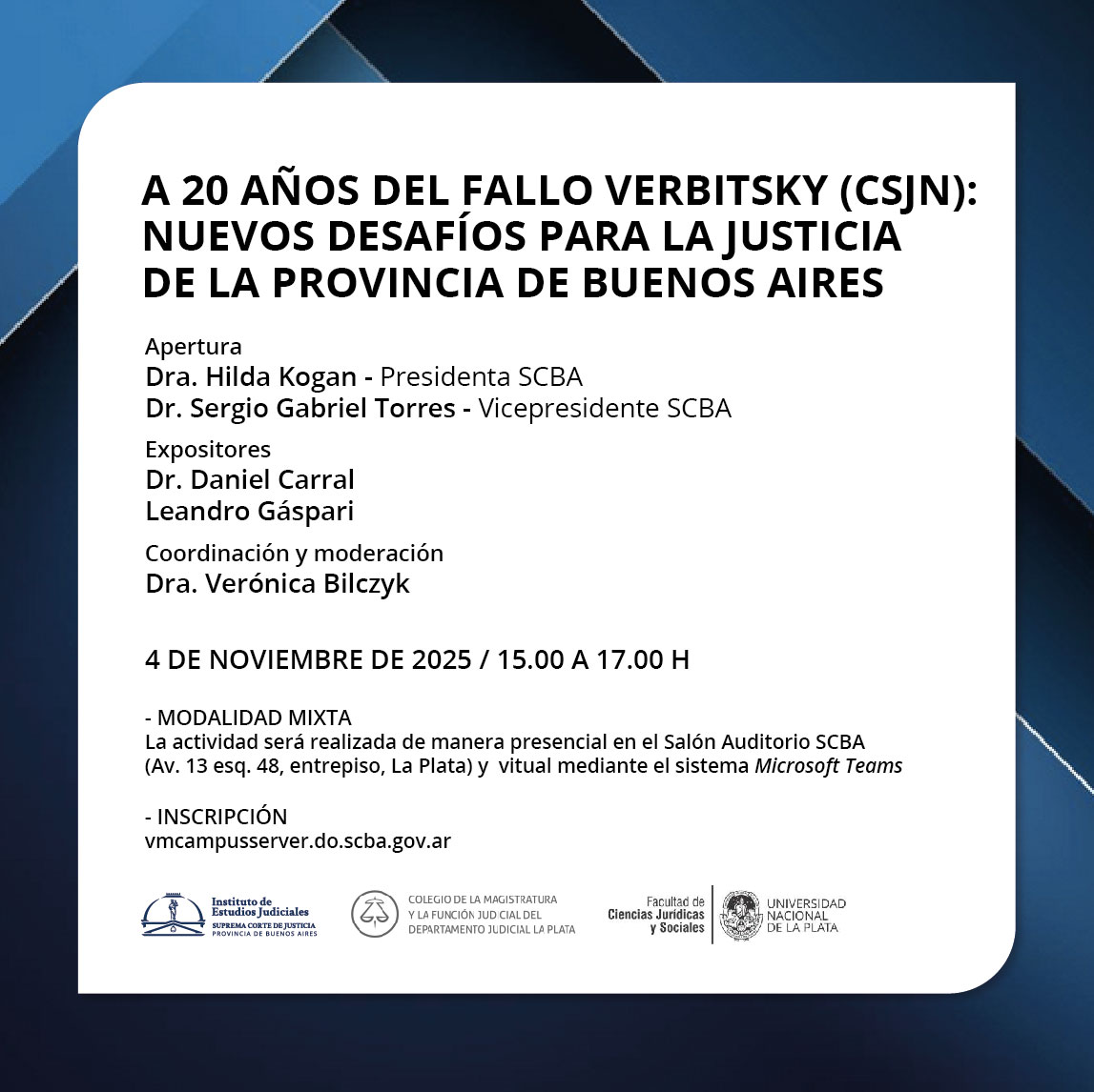Organizado junto con el Colegio de la Magistratura y la Función Judicial del Departamento Judicial La Plata y la Facultad de Ciencias Jurídicas y Sociales de la UNLP. / Disertantes: Dr. Daniel Carral y Leandro Gáspari / Apertura: Dra. Hilda Kogan - Presidenta SCBA y Dr. Sergio Gabriel Torres - Vicepresidente SCBA / Coordinación y moderación: Dra. Verónica Bilczyk / Fecha y hora: 4 de noviembre de 2025 de 15 a 17 / Lugar y hora: Salón Auditorio SCBA (Av. 13 esq. 48, entrepiso, La Plata) / MODALIDAD MIXTA