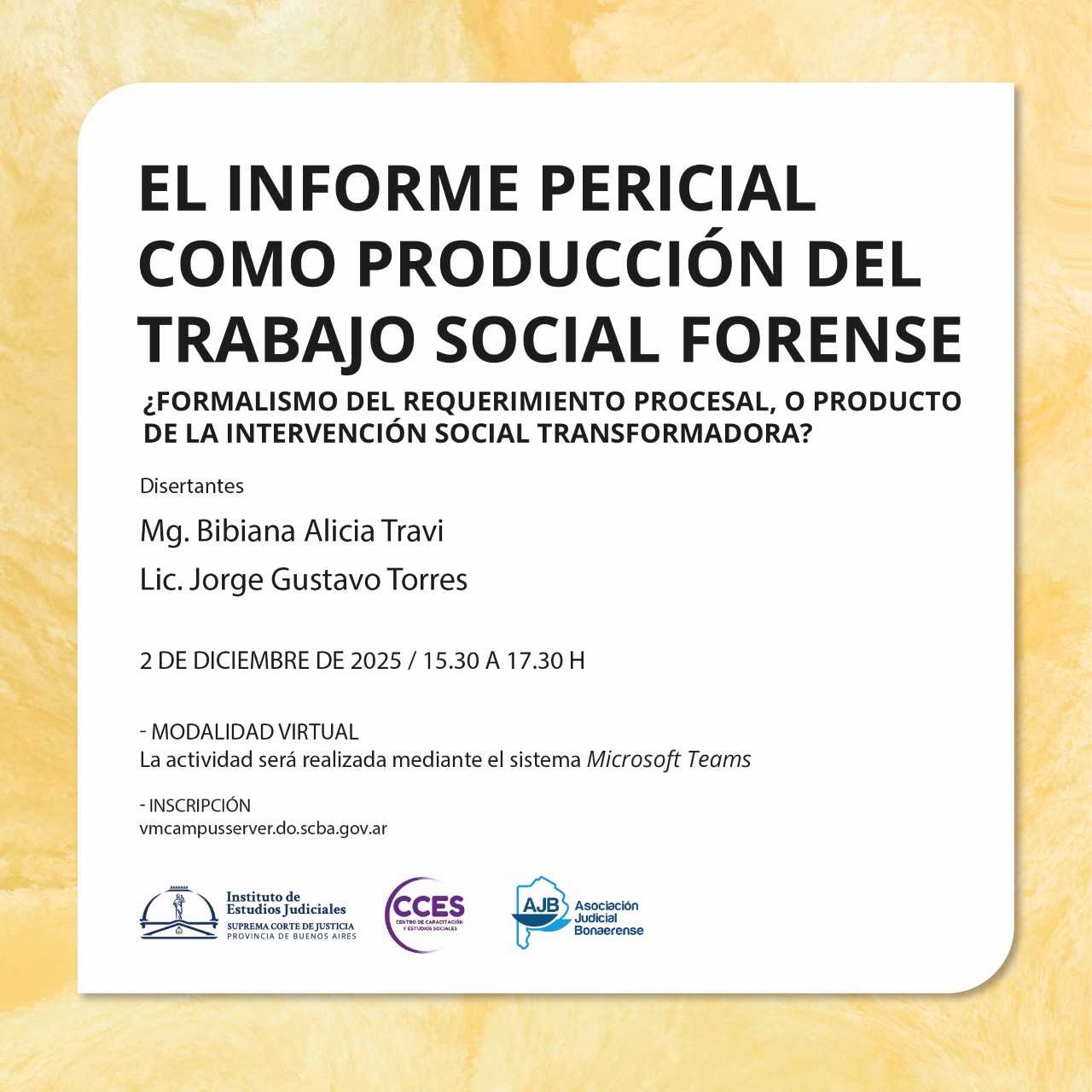 Organizado junto con el Centro de Capacitación y Estudios Sociales – CCES - y la Asociación Judicial Bonaerense -AJB- / Fecha y horario: 2 de diciembre de 2025, de 15.30 a 17.30 h / MODALIDAD VIRTUAL (Teams).