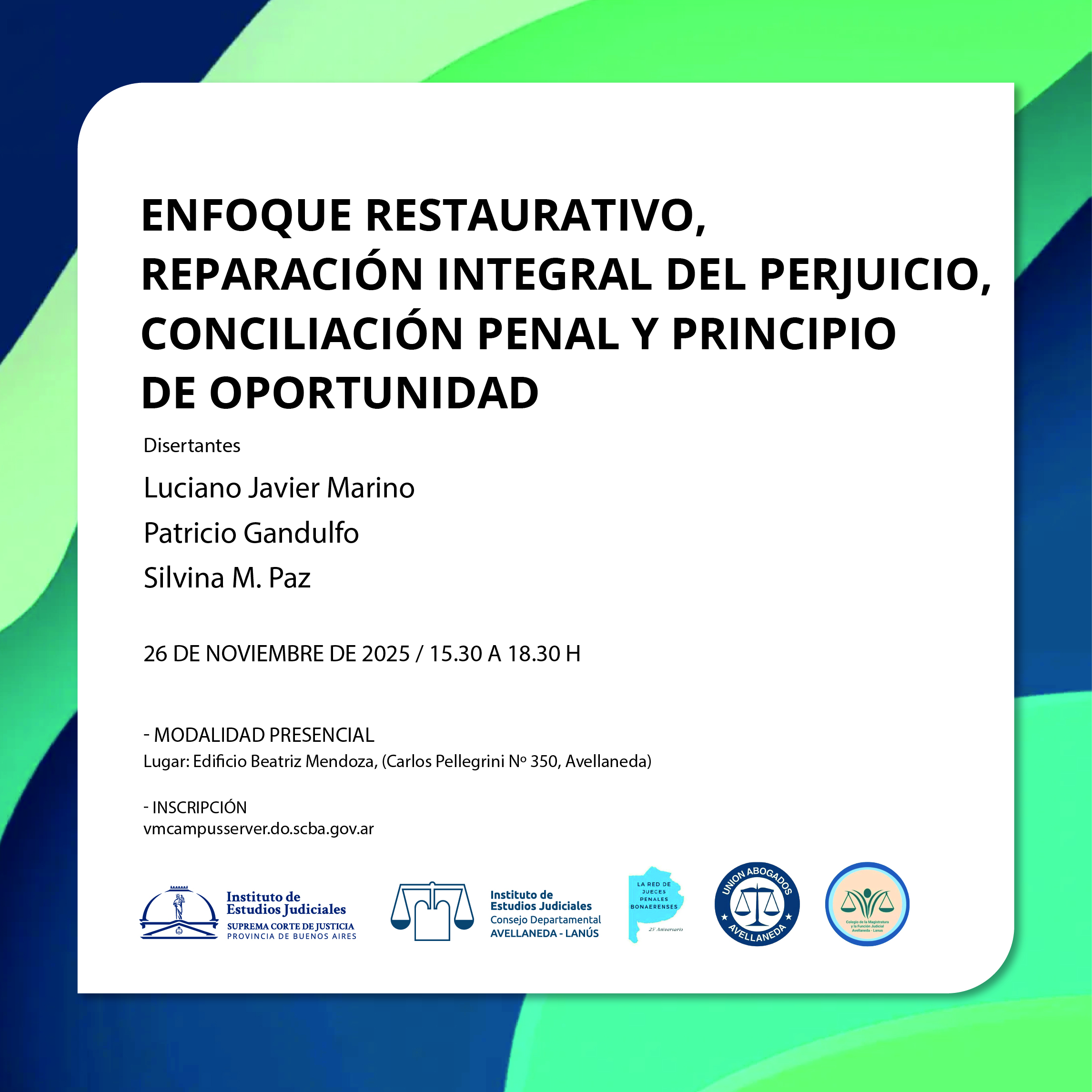 Organizado junto con la Red de Jueces Penales Bonaerenses, el Consejo departamental del IEJ, la Unión Abogados y el Colegio de la Magistratura y la Función Judicial del departamento judicial Avellaneda- Lanús / Fecha y horario: 26 de noviembre de 2025, de 15.30 a 18.30 h / Lugar: Edificio Beatriz Mendoza, (Carlos Pellegrini Nº 350, Avellaneda) / MODALIDAD PRESENCIAL
