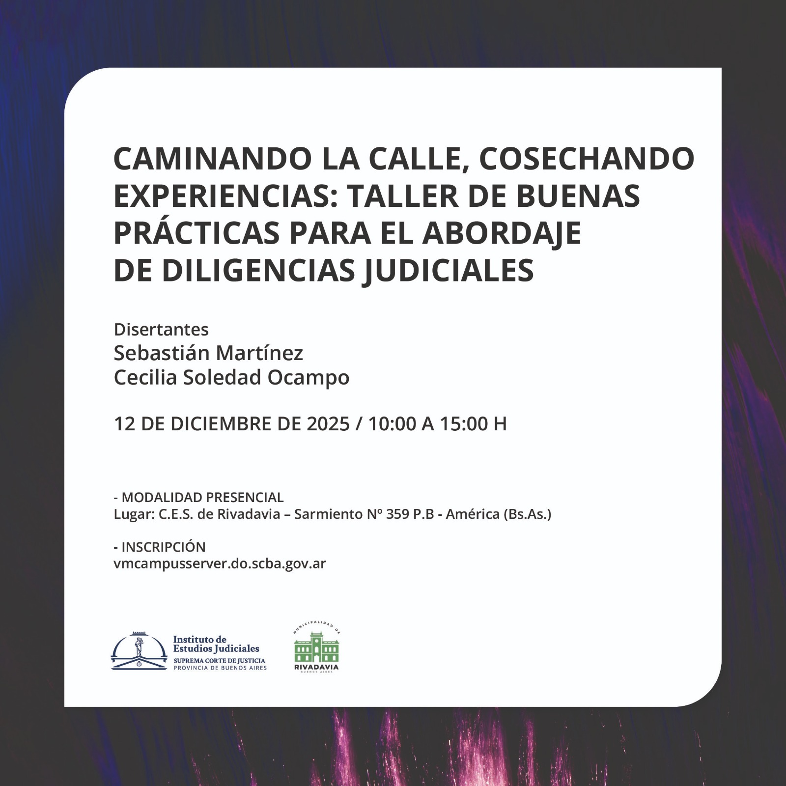 Organizado junto con la Dirección de Justicia de Paz Letrada de la SCBA y la Municipalidad de Rivadavia / Fecha y horario: 12 de diciembre de 2025, de 10 a 15 h / Lugar: C.E.S. de Rivadavia – Sarmiento Nº 359 P.B- América (Bs.As.) / MODALIDAD PRESENCIAL