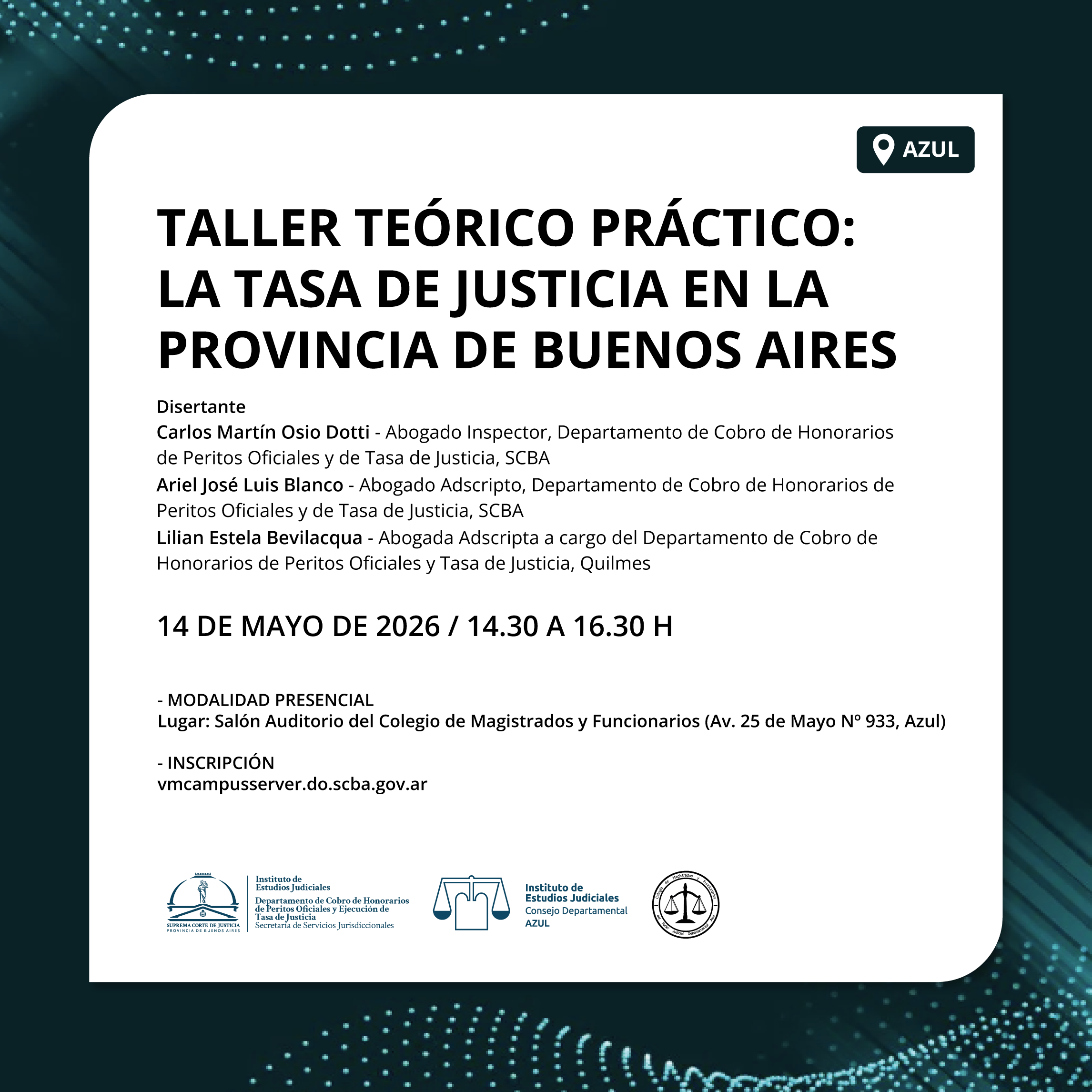 Organizado junto con el Departamento de Cobro de Honorarios de Peritos Oficiales y Ejecución de Tasa de Justicia del departamento judicial de Quilmes, la Secretaría de Servicios Jurisdiccionales SCBA, el consejo departamental del IEJ y el Colegio de Magistrados y Funcionarios del departamento judicial Azul / Fecha y horario: 14 de mayo de 2026, de 14.30 a 16.30 h / MODALIDAD PRESENCIAL / Lugar: Salón Auditorio del Colegio de Magistrados y Funcionarios Departamental (Av. 25 de Mayo Nº 933, Azul)
