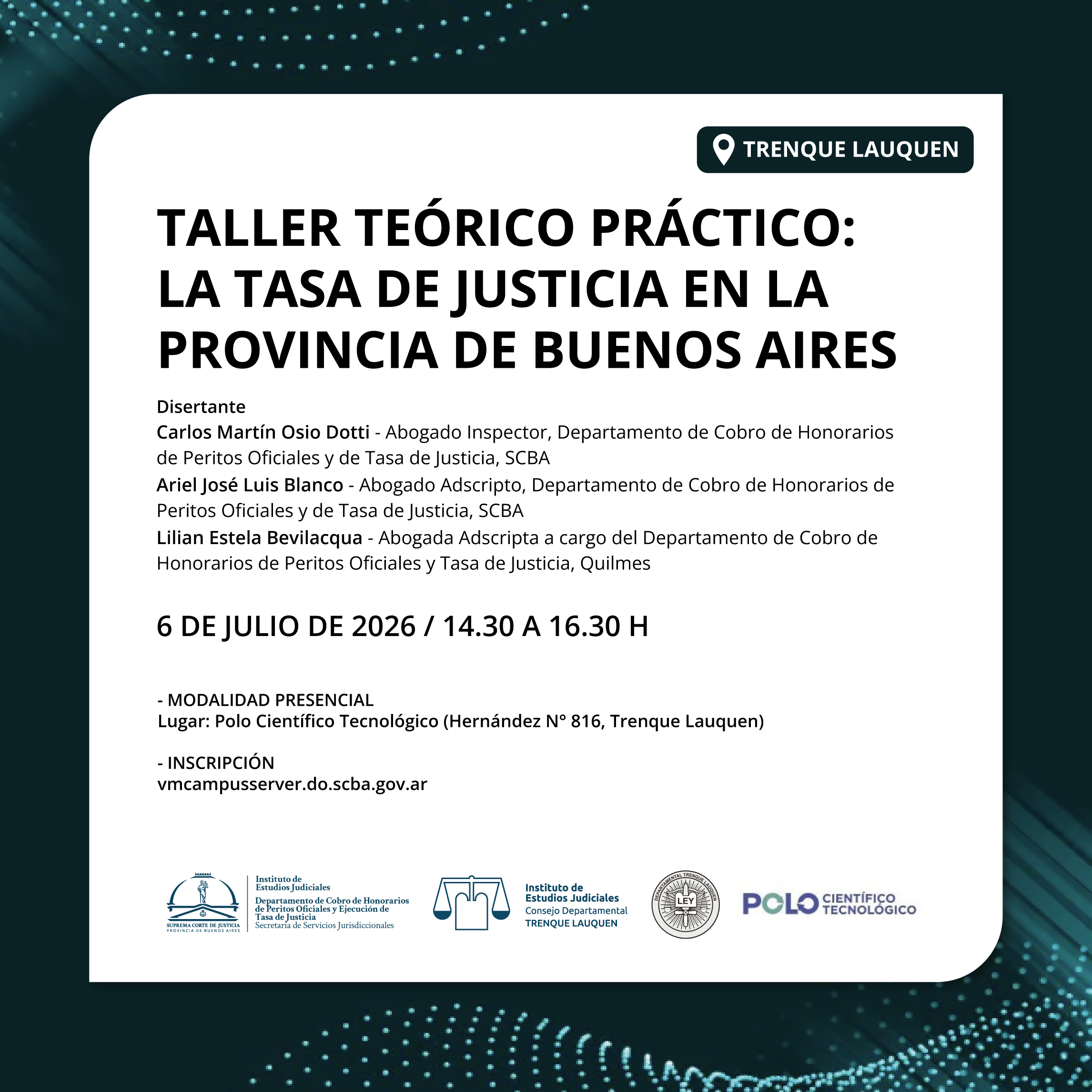 Organizado junto con el Departamento de Cobro de Honorarios de Peritos Oficiales y Ejecución de Tasa de Justicia del departamento judicial de Quilmes de la Secretaría de Servicios Jurisdiccionales, el Polo Científico Tecnológico, el consejo departamental del IEJ y el Colegio de Magistrados y Funcionarios del departamento Judicial Trenque Lauquen / Fecha y horario: 6 de julio de 2026, de 14.30 a 16.30 h / MODALIDAD PRESENCIAL / Lugar: Polo Científico Tecnológico ( Hernández N° 816, Trenque Lauquen)