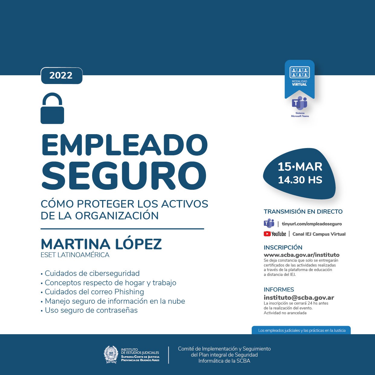 Organizado junto al Comité de Implementación y Seguimiento del Plan integral de Seguridad Informática de la SCBA Destinatarios: personal de la Administración de Justicia de la Suprema Corte de Justicia de la Provincia de Buenos Aires. Se acreditan 2 horas de capacitación.